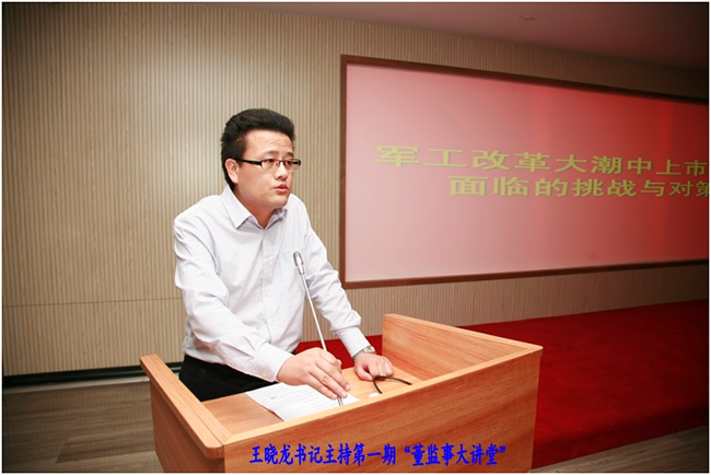 10月25日下午,公司第五屆董事會戚全魁董事應(yīng)邀在公司舉辦的“董監(jiān)事大講堂”作了題為《軍工改革大潮中上市公司面臨的挑戰(zhàn)與對策》的專題講座,公司黨總支書記王曉龍主持本次大講堂,劉克勝總經(jīng)理及高管成員出席了本次講座。