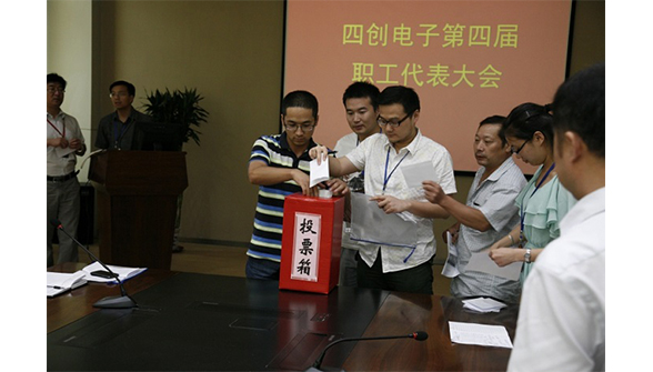 在總監(jiān)票人和監(jiān)票人的監(jiān)督下,到會(huì)的64名正式代表以無(wú)記名投票的方式,選舉出王曉龍等9人為四創(chuàng)電子第四屆分工會(huì)委員。